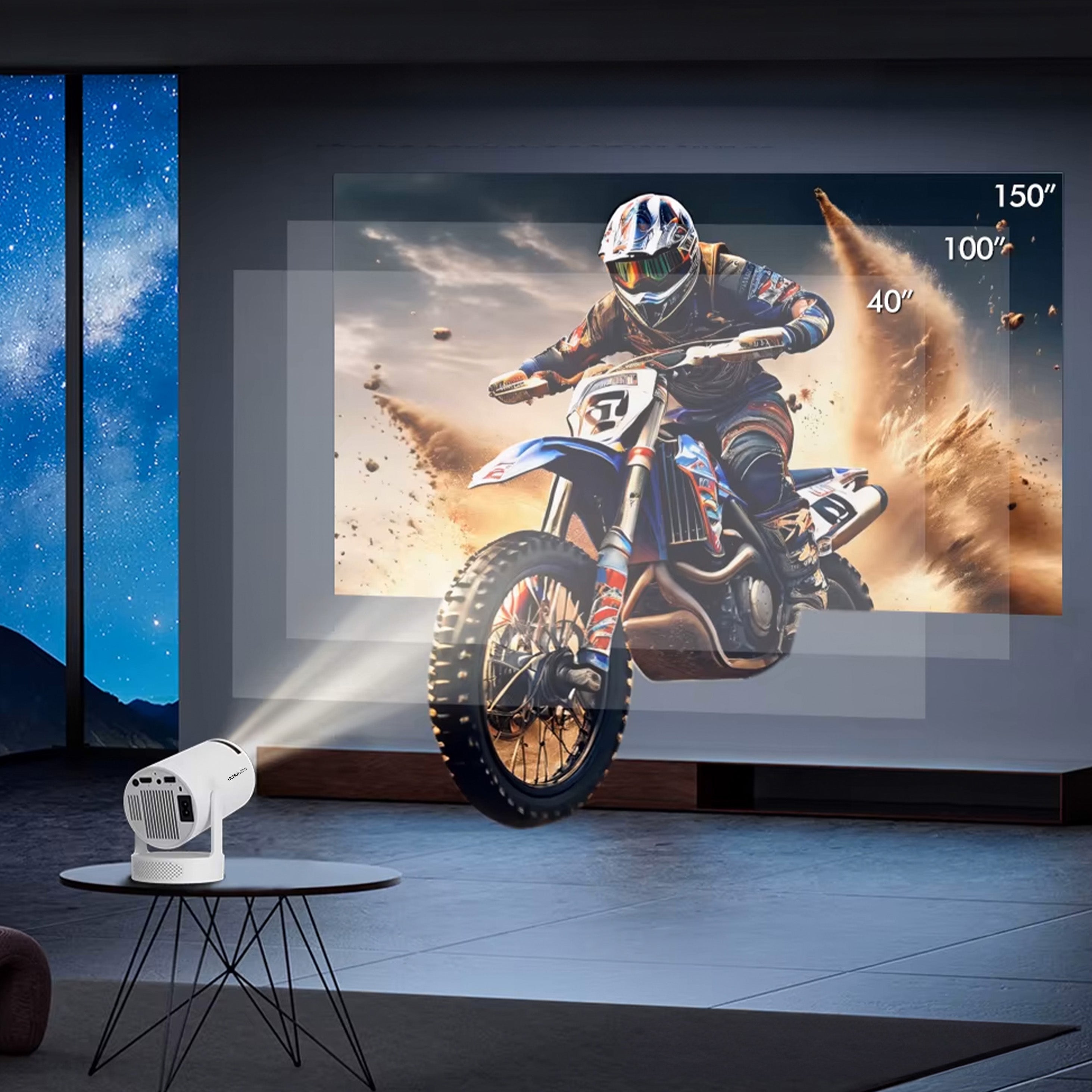 Live life large with the UltraView. Its adjustable 150-inch 1080p display with 4K support, transforms any space into a vibrant viewing arena, perfect for movie night, gaming, and more