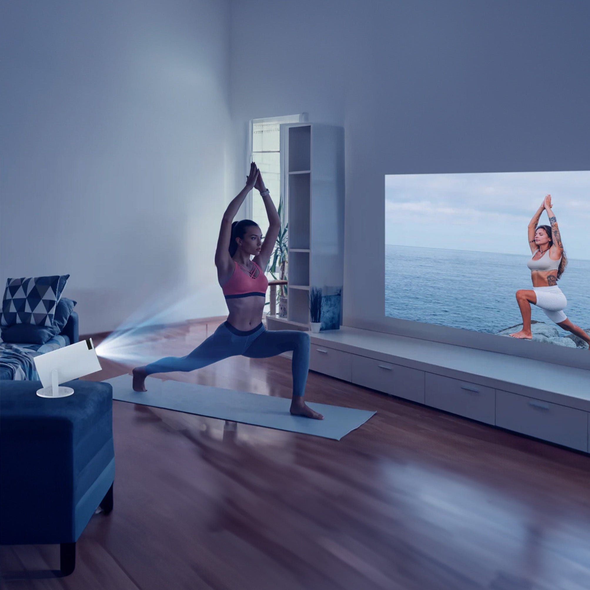 Create your personal wellness retreat anywhere. The UltraView brings your favorite yoga sessions and fitness programs to life, projecting them onto any space. Perfect for maintaining your routine at home or while traveling.
