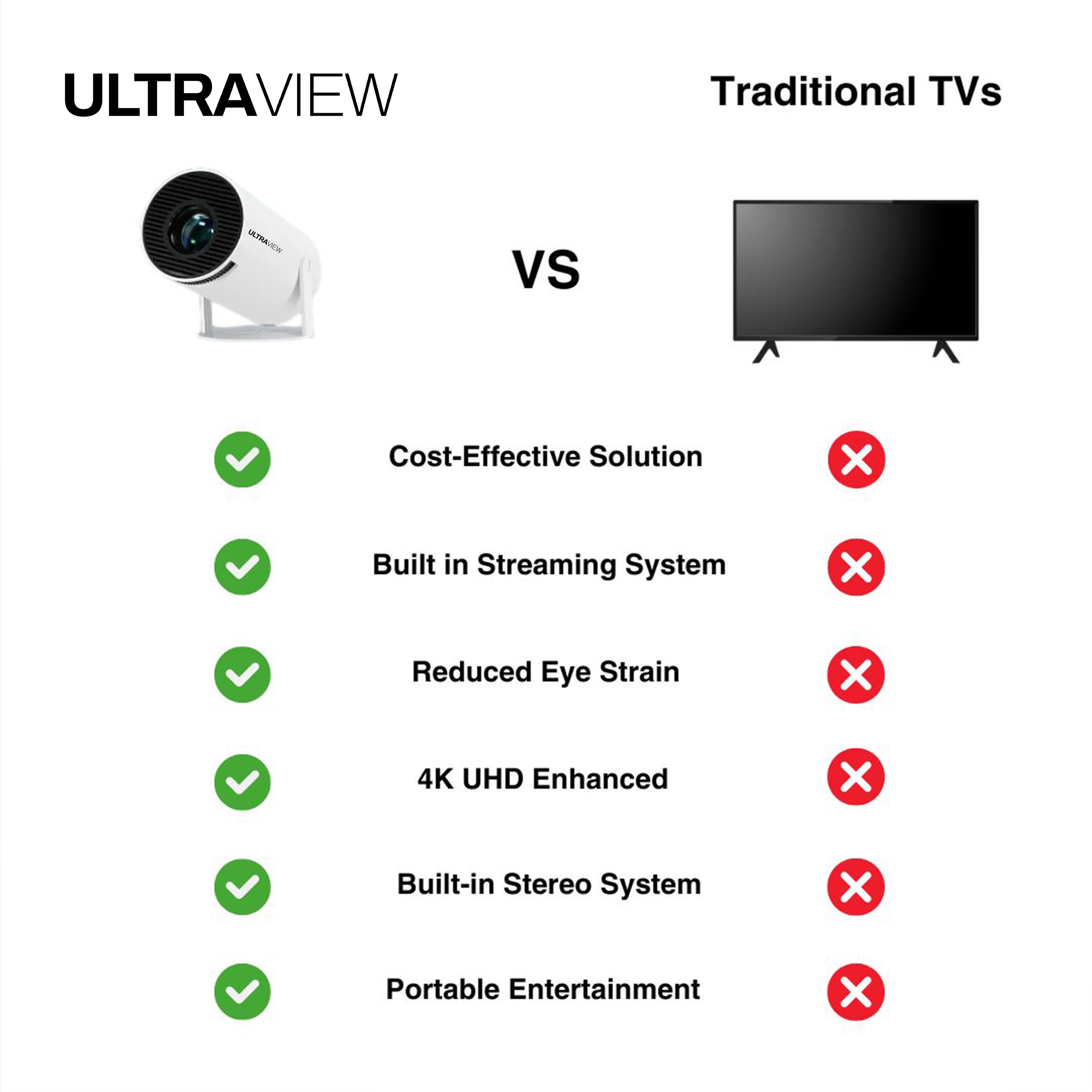 UltraView outshines traditional TVs with built-in streaming, 180° swivel projection, and true portability—entertainment, anywhere you want it.